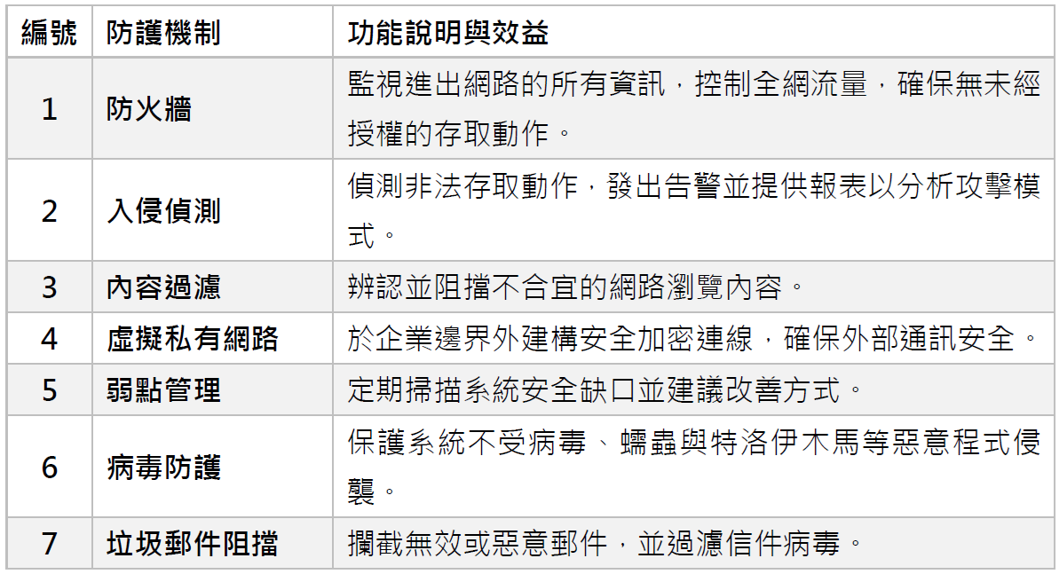 針對潛在資安風險,本公司目前已部署以下七大技術防護措施: