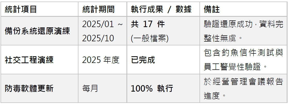 2025 年度(2025/01 ~ 2025/12)重點資安工作執行成果如下: