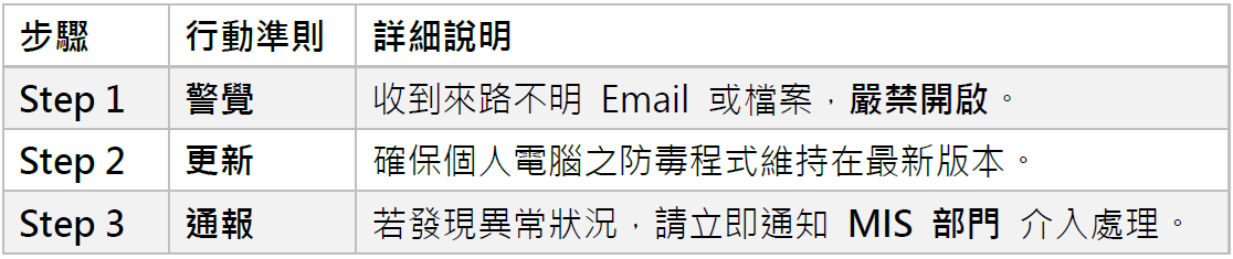 為防範勒索病毒與加密軟體威脅,已確立標準應變程序並向全員宣導: